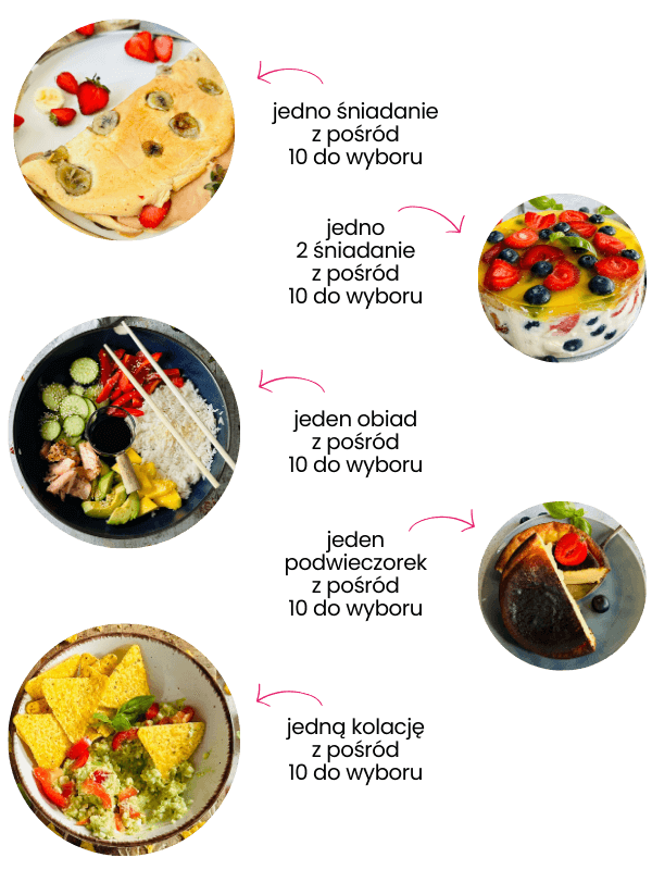 Otrzymujesz po 10 propozycji: śniadań, II śniadań, obiadów, podwieczorków i kolacji. Łącznie 50 przepisów, które możesz dowolnie miksować i tworzyć inne menu każdego każdego dnia.