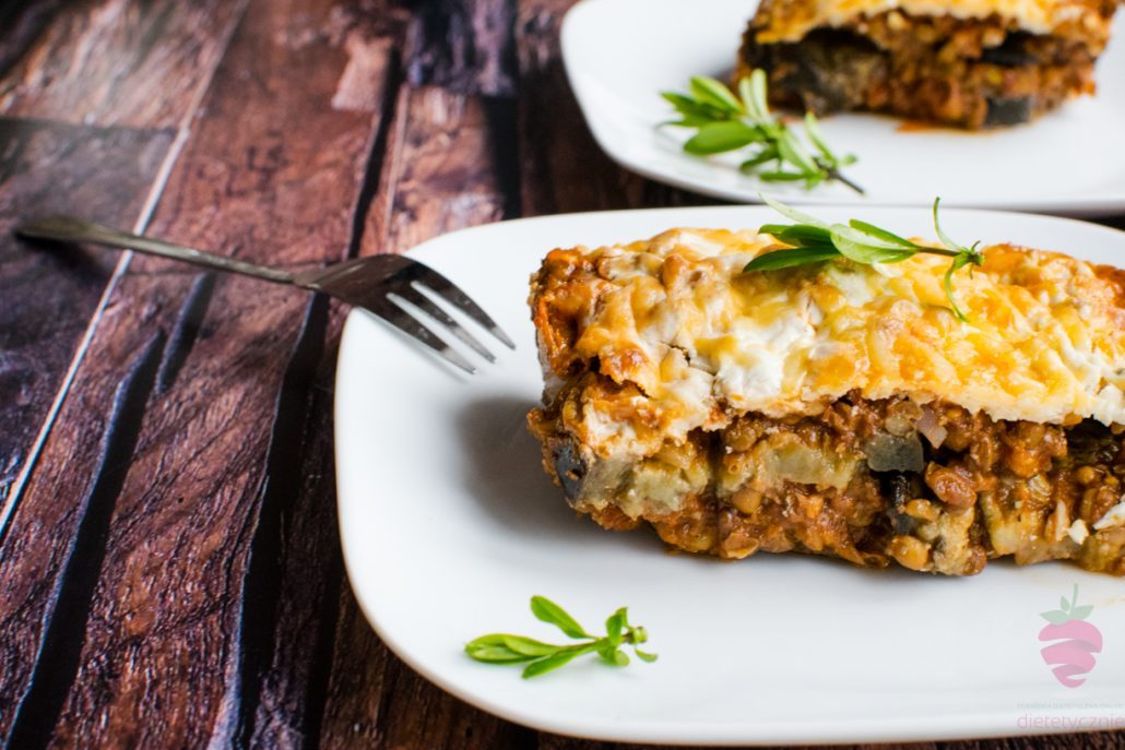 Na pierwszą warstwę bakłażanów dajemy nasz soczewicowy farsz, układamy kolejną warstwę bakłażanów, kolejną porcję farszu i zalewamy jogurtowo-jajecznym sosem i posypujemy serem.